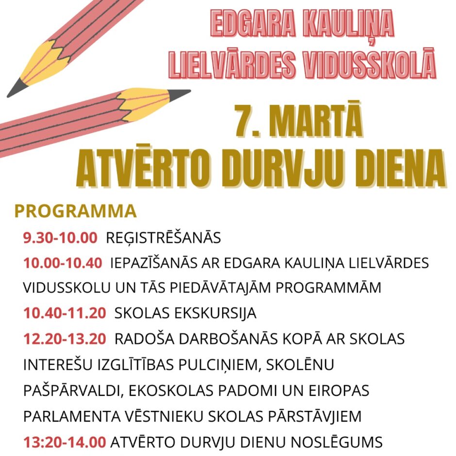 Edgara Kauliņa Lielvārdes vidusskola aicina topošos vidusskolēnus uz atvērto durvju dienu 7. martā plkst. 10.00. Būs iespēja iepazīties ar vidusskolas piedāvātajām izglītības programmām, skolas telpām, pedagogiem, skolēnu pašpārvaldi un citām interesantām aktivitātēm, kuras norisinās Edgara Kauliņa Lielvārdes vidusskolā. Uz atvērto durvju dienu lūgums pieteikties, līdz 5. martam aizpildot veidlapu https://forms.gle/VyzXPG2gCMGAmVtd8