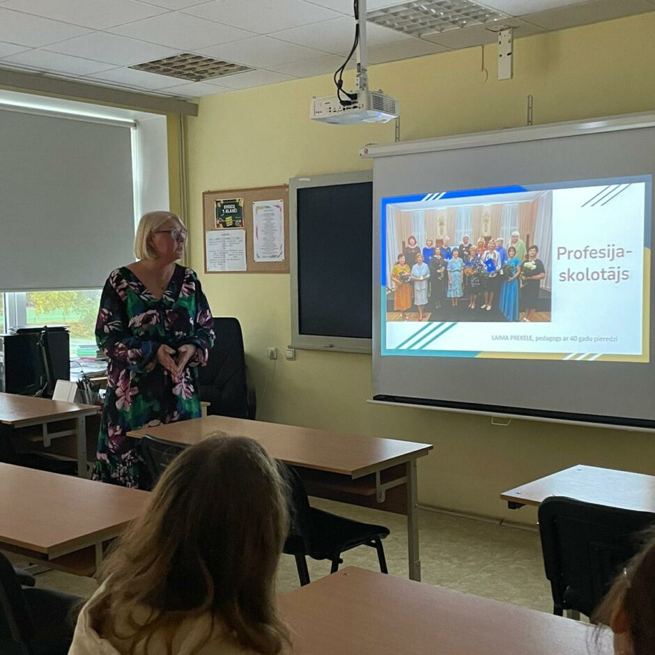 Vēstures skolotāja Diāna Hristenko 7.a, 7.b, 8.a, 8.b, 9.a, 9.b, 9.c, 10.m klasei novadīja prezentāciju par vēstures izglītību, iespējām, karjeras iespējām un cilvēkiem, kuriem ir vēstures bakalaurs un augstāk, piemēram, LR prezidents Edgars Rinkēvičs.