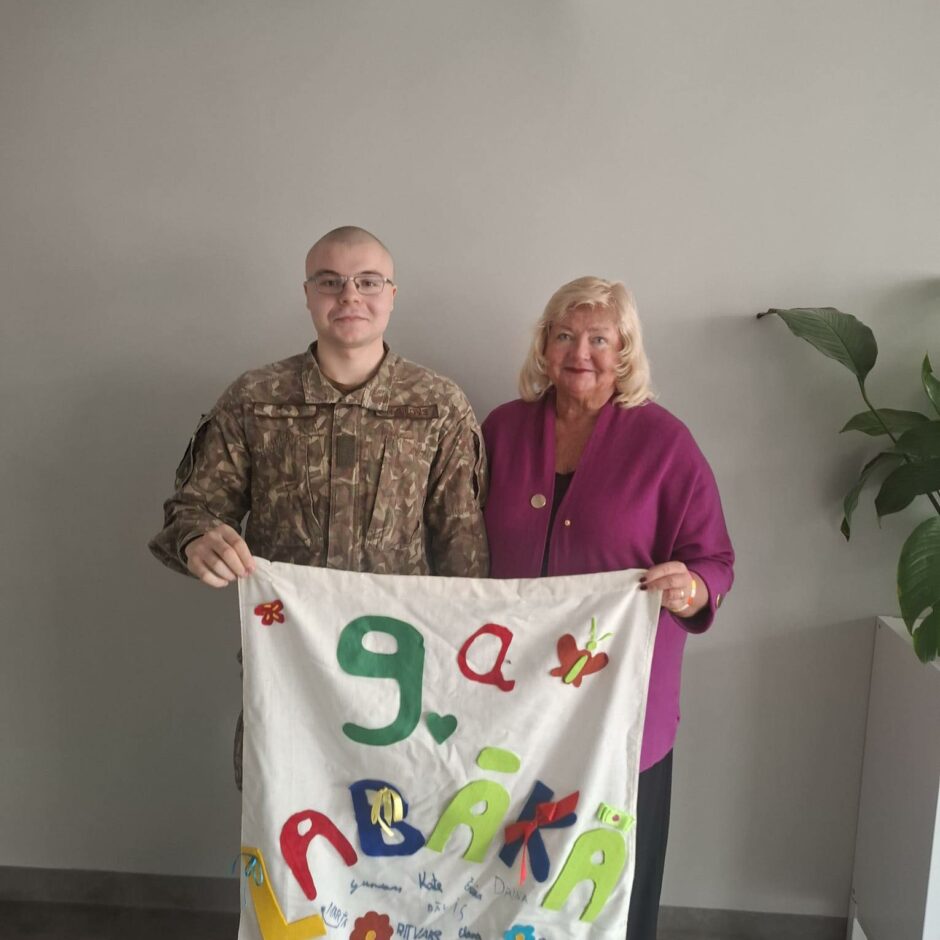 Mūsu skolas pedagogi vienmēr ir priecīgi skolā sagaidīt savus bijušos audzēkņus. Fotogrāfijā redzams Ronalda bijušās klases karogs, uz kura lasāms arī viņa vārds.
